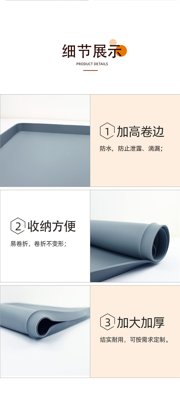 硅膠水槽墊可以在多個不同環(huán)境情況下正常使用,產(chǎn)品不僅可以用于下水槽隔水使用,也可以用于家居防滑腳墊以及廚房洗手臺物品收納擺放作用,硅膠材質特性特殊,具備一定的防滑效果和隔熱功能,外圍一圈為擋墻,可以戶外進行物品擺放以及高低溫存放,便于收納以及折疊攜帶等